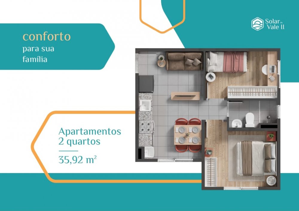 Localizada na Avenida Mato Grosso, bairro Santa Terezinha, Fazenda Rio Grande/PR, condomínio Residencial Solar do Vale II, Apartamento, Lançamentos, Pré-Lançamento, Área privativa de 35.92m², 2 dormitório, 1 banheiro, 1 sala, 1 garagem,